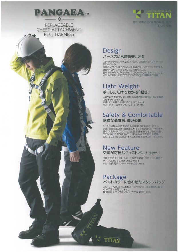 PDFファイルで見る 「使い心地」「軽さ」そして「着る楽しさ」を兼ね備えたフルハーネスです。 腿ベルトの形状がV字タイプの『CANYON(キャニオン)』と、 水平タイプの『HORIZON(ホライゾン)』の2種類をご用意しております。 < 前の商品 一覧